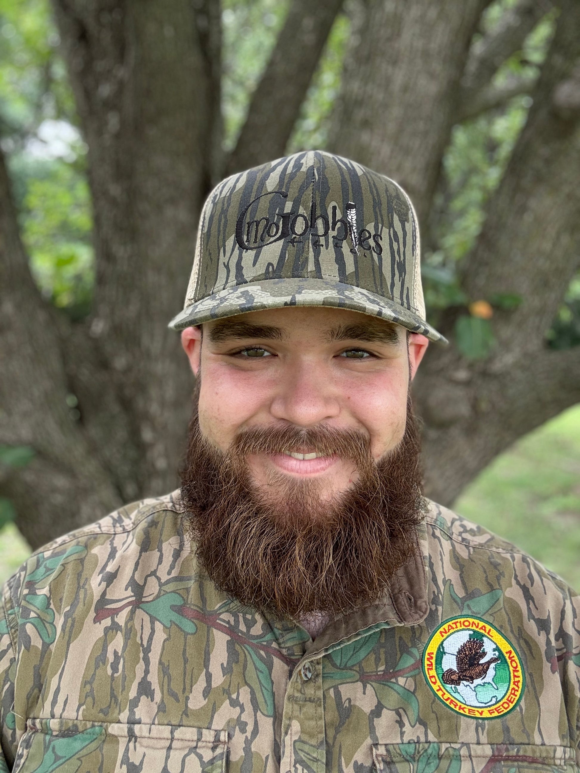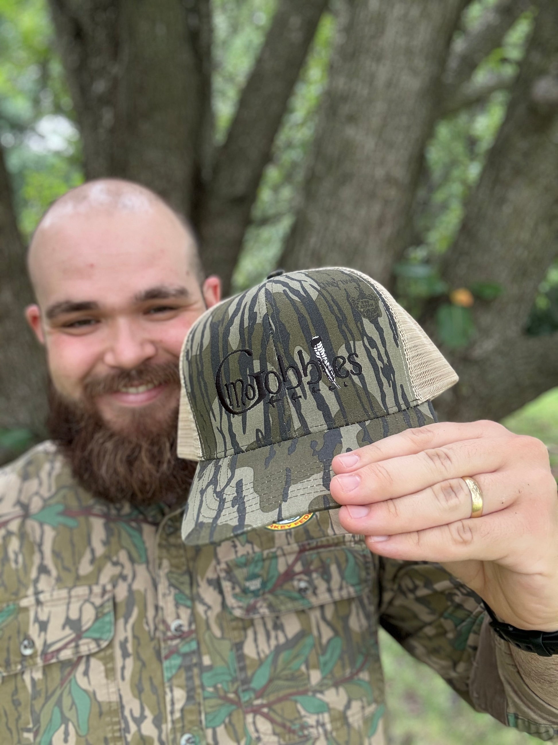"MoGobbles" Formed Trucker Bottomland/Tan with Black Text.